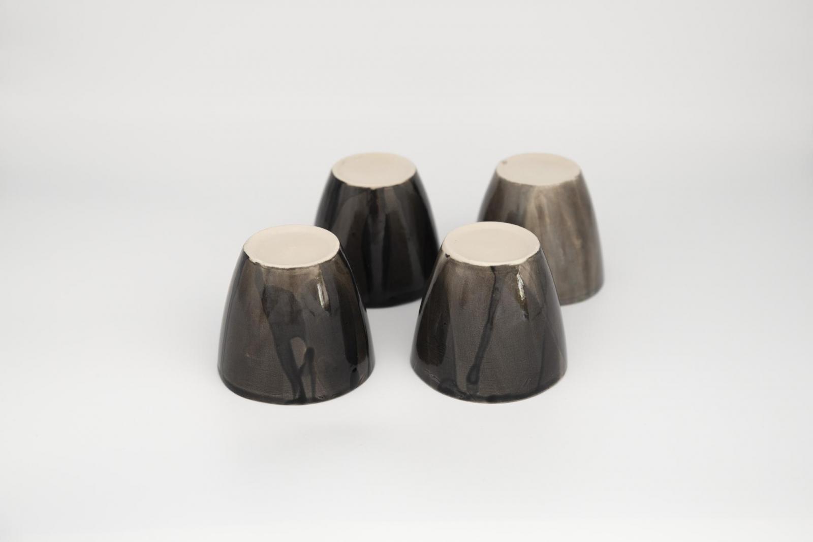 Geschirr-Set aus Steinzeug, gegossen, Glasur: schwarz und transparent glanz Teller: ca. ⌀ 21,5 x 27cm, 49.- / Tassen: h 7,5cm, ⌀ 8cm, 29.- / Schalen: h 4cm, ⌀ 12cm, 22.- ganzes Set: 397.-