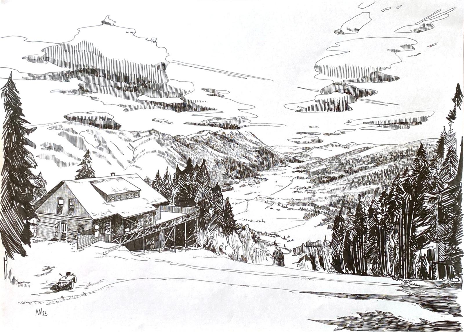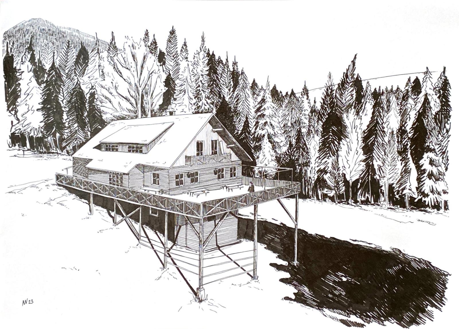 Als Auftrag entstanden diese 6 Fineliner-Zeichnungen von der Berggeisthütte (A), die zum Hotel Löffele gehört: eine wunderschöne und empfehlenswerte Feriendestination für im Sommer und im Winter. @ https://www.loeffele.at Fineliner auf Papier, 2x A6, 2x A4, 2x A3