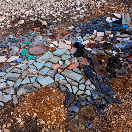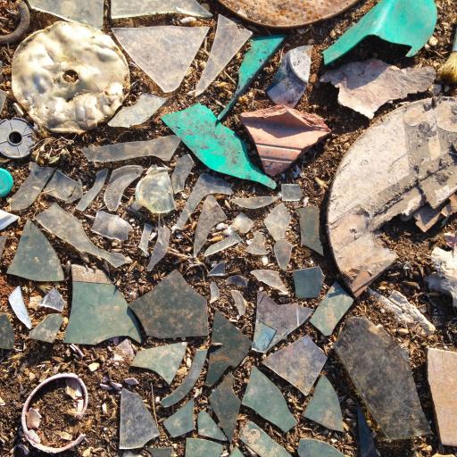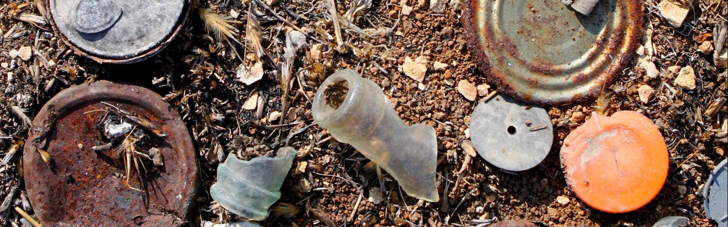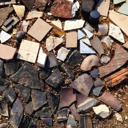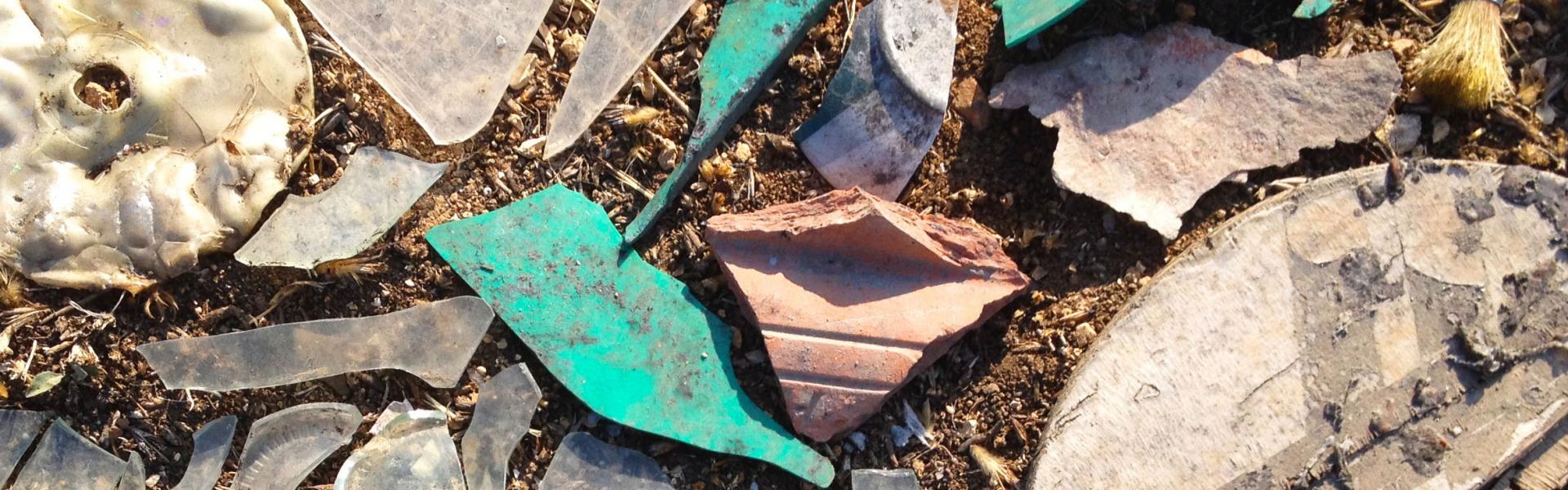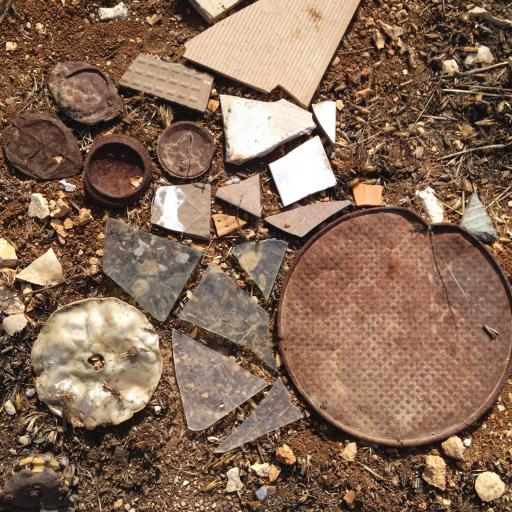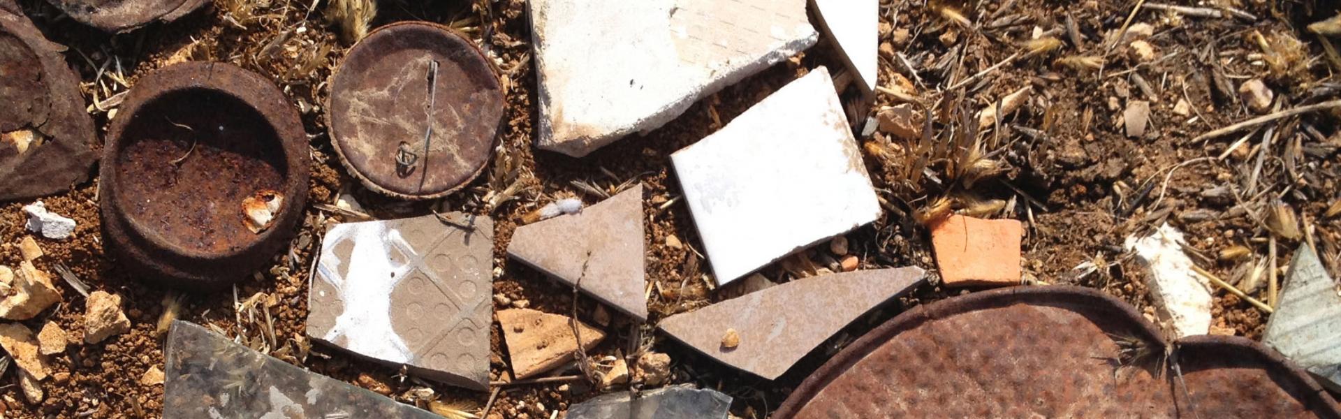 Drei Installationen in drei unterschiedlichen Ruinen; Scherben, Plastikabfall, Verbranntes und rostige Blechteile, Israel 2013/2014