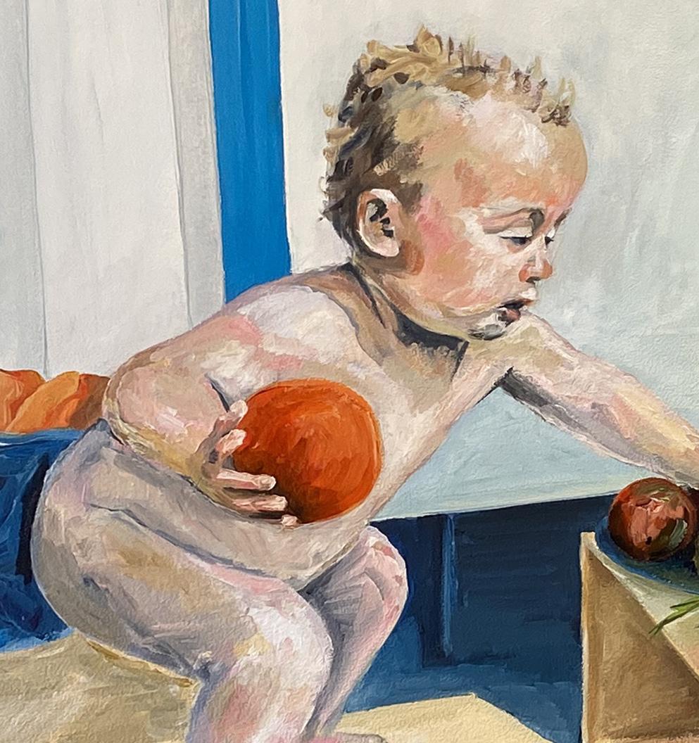 Mein Neffe gibt sich als perfektes Modell. Er interagiert mit einem Früchte-Stillleben und schafft eine Spannung durch die gut balancierte Position auf der Box.